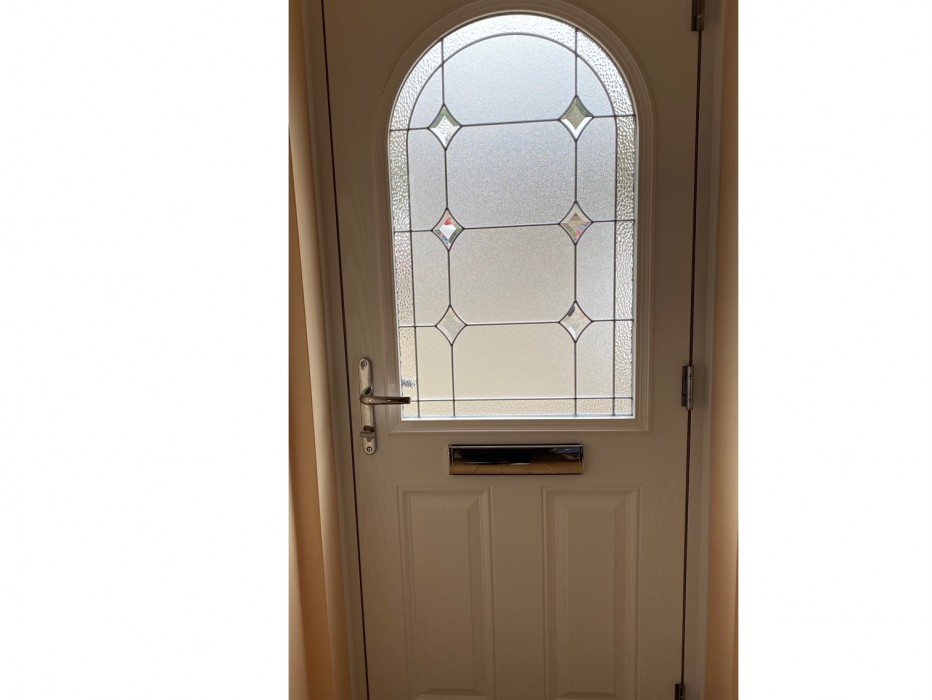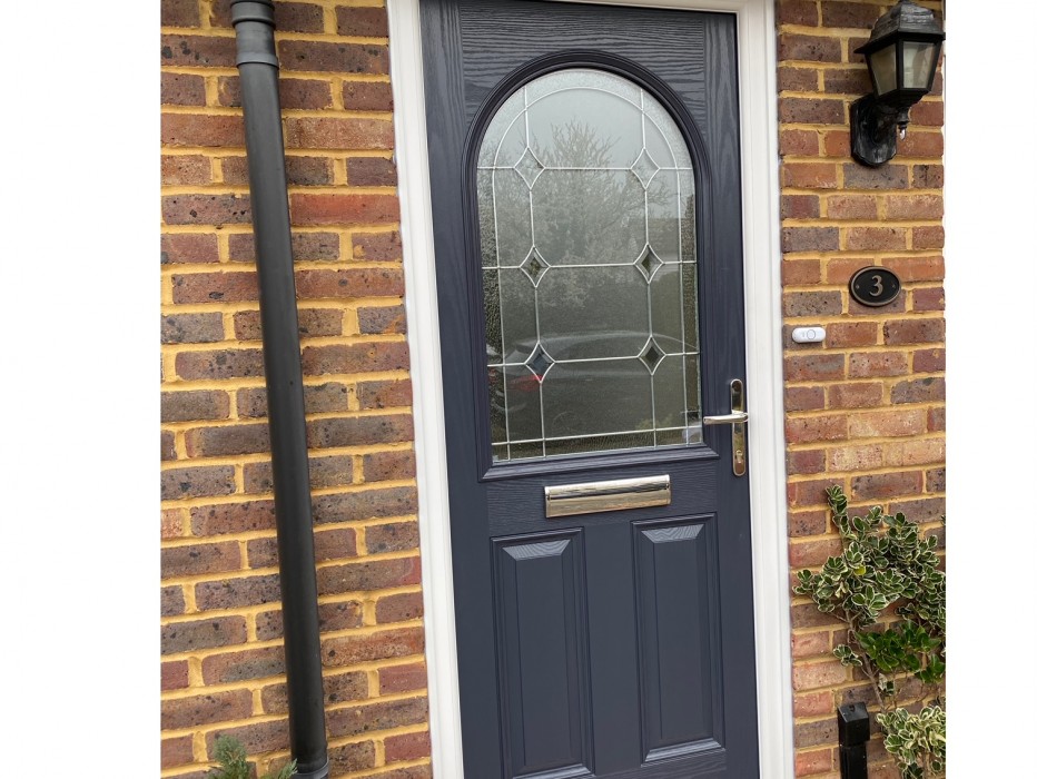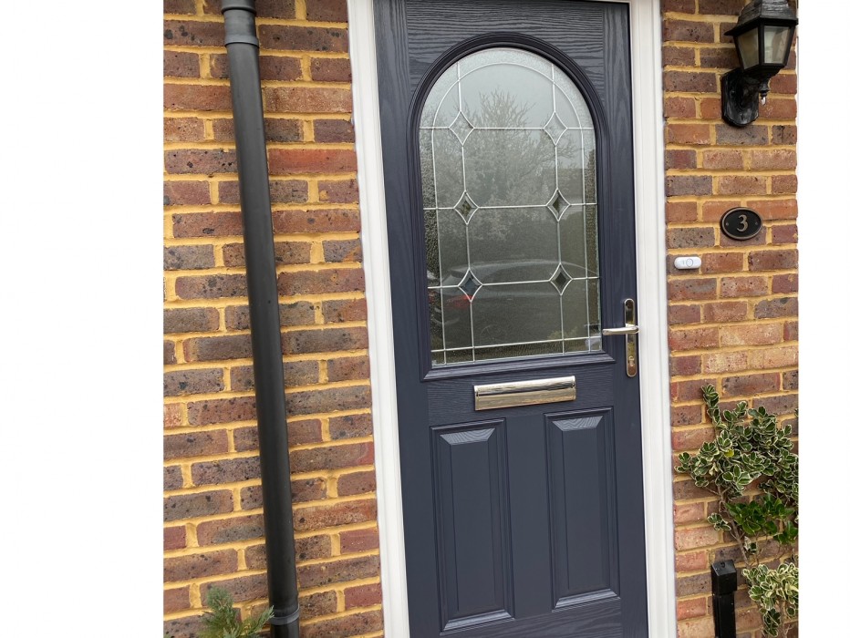Anthracite Grey Magnum 9 Composite Door. Palma patterned glass to door, Chrome Lever Handle, with Thumbturn locking mechanism on the internal handle. Recently installed in Swanley Village