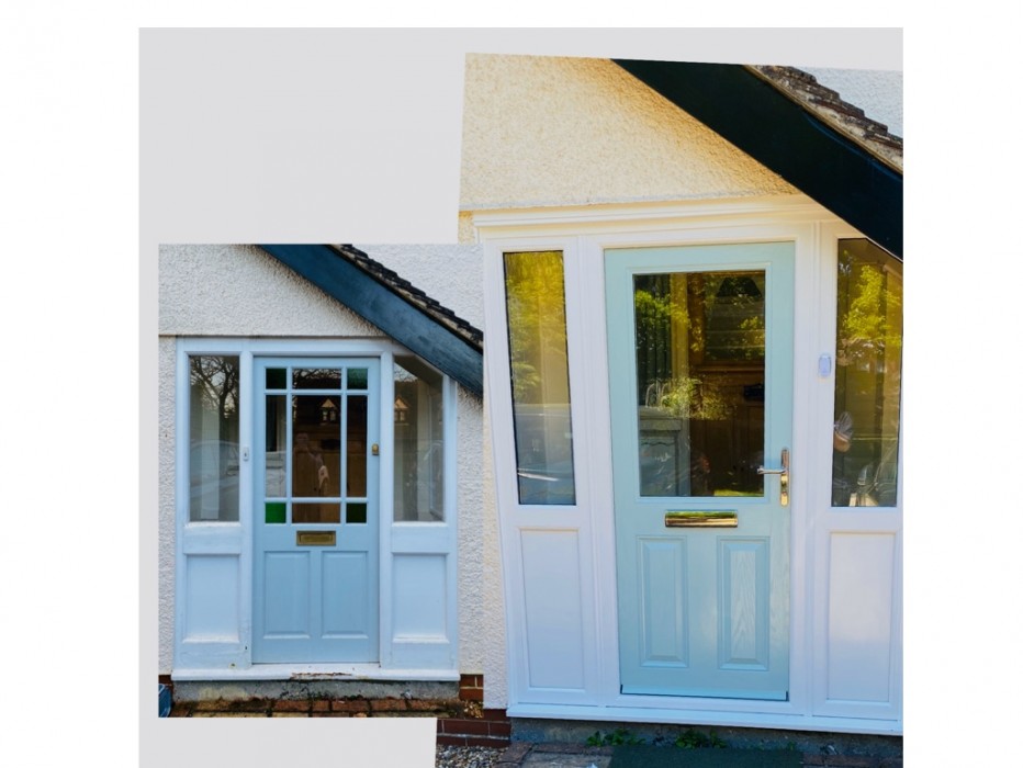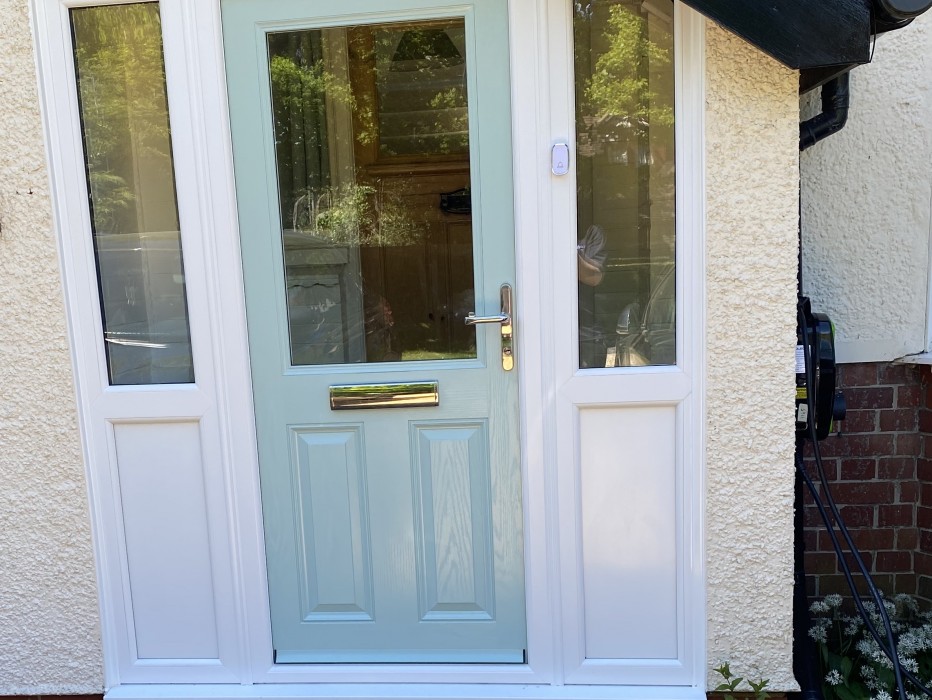 Magnum 10 styled Composite Front Door in Duck Egg blue with two White UPVC side panels one of which is angled to allow for the slant of the roof.
