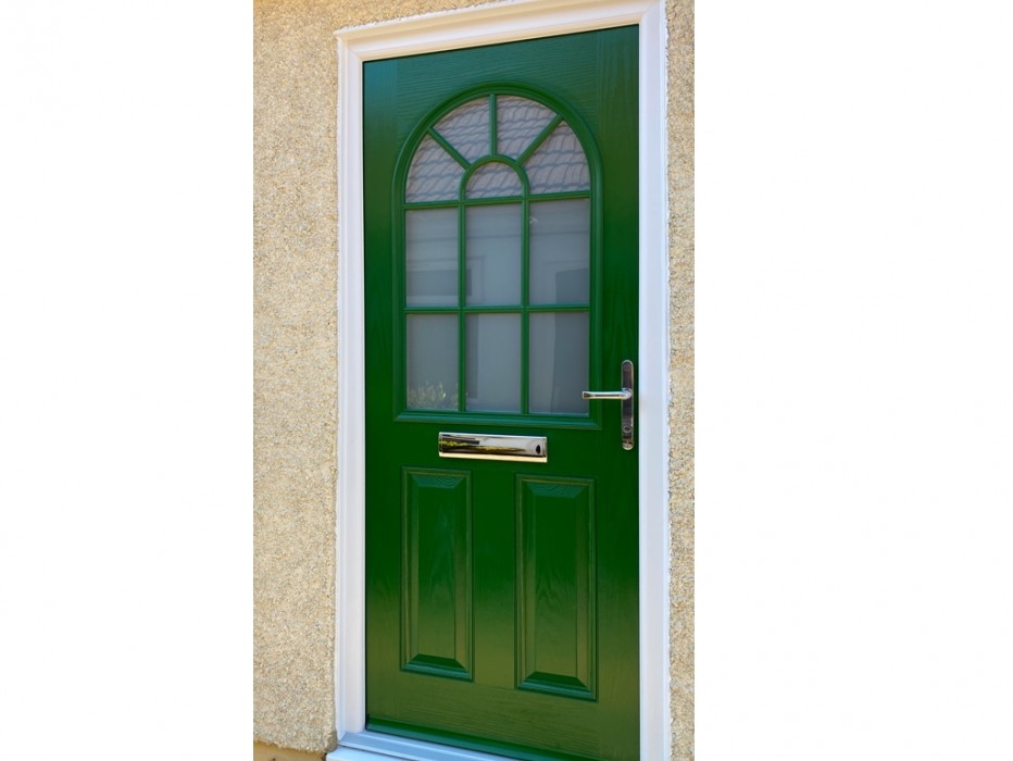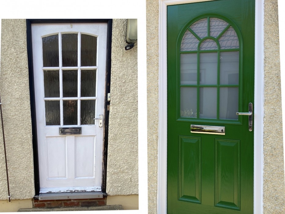 Magnum 13 Composite Door in Leaf Green with Satin Glass and chrome furniture from a recent installation in Sutton-At-Hone.