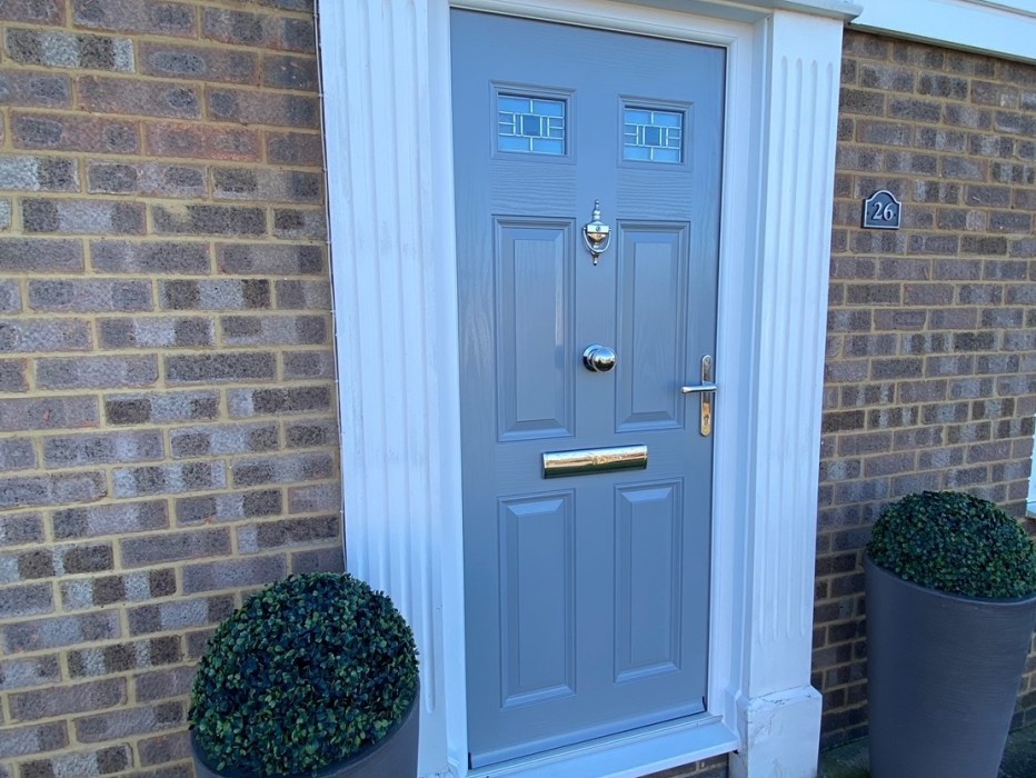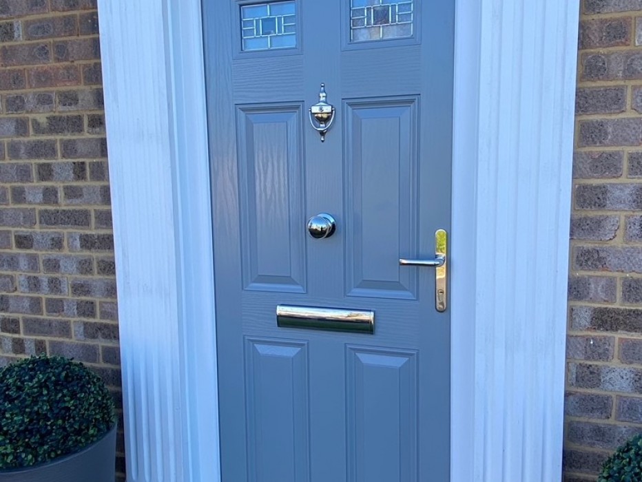 Traffic Grey Magnum 2 Composite Front Door with Aspen Decorative glass. and chrome furniture recently installed in Hextable, Kent.