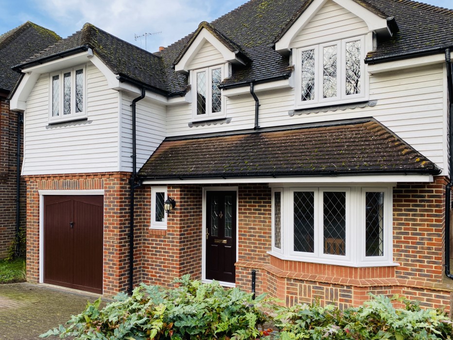 New white UPVC Front Windows and Rosewood Composite Front Door, installed in Eynsford, making for a striking appearance.