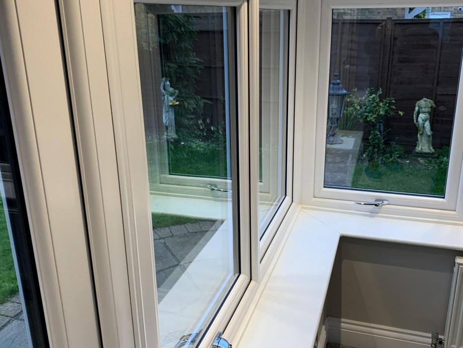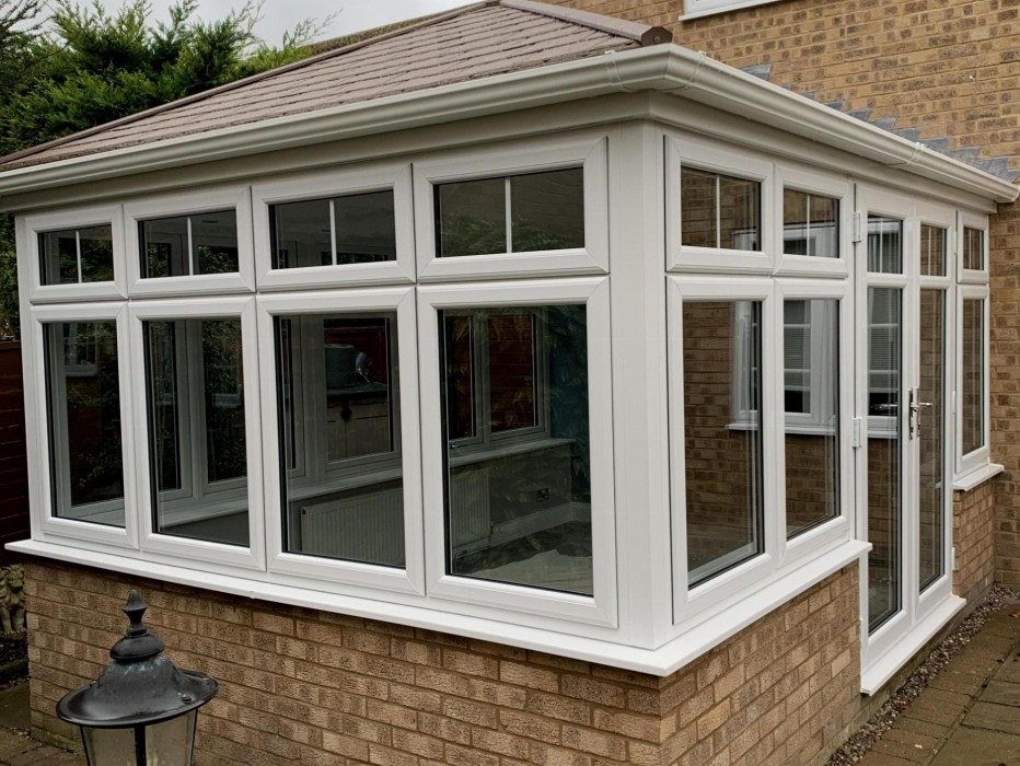 White UPVC WIndows with equal sight lines with Georgian Bar fanlights fitted with a tiled conservatory roof.