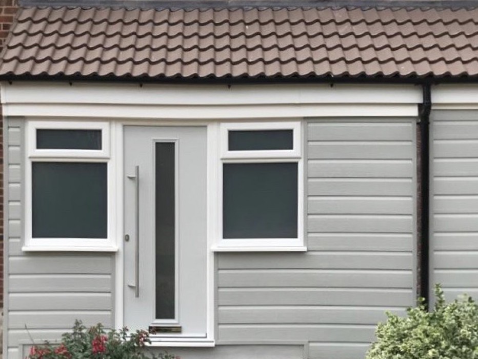 Composite Front door, with tiled roof and cladding. Framed Windows on the side giving a welcome look.