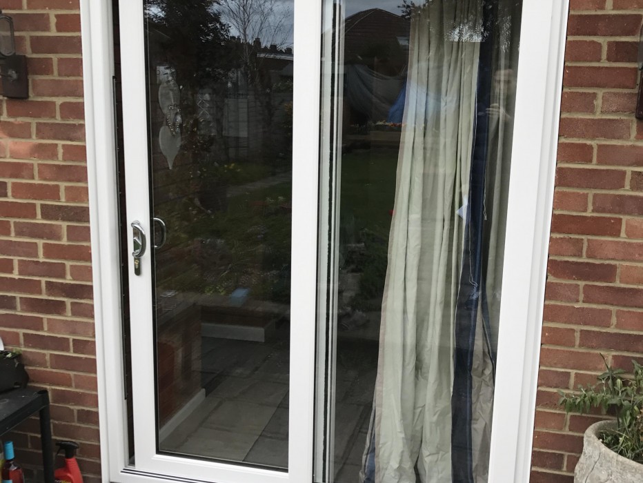 White UPVC A-rated double glazed patio door set, with black UPVC cill, installed in dartford.
