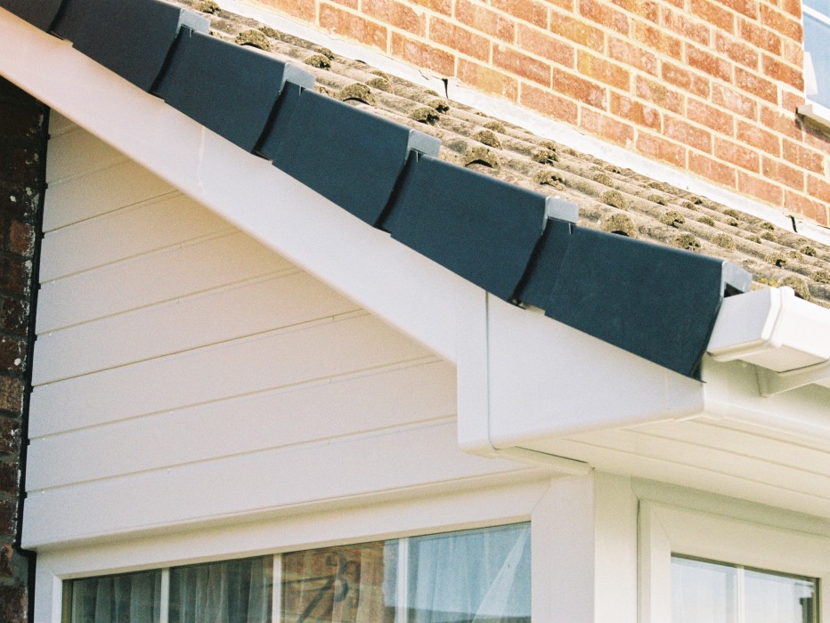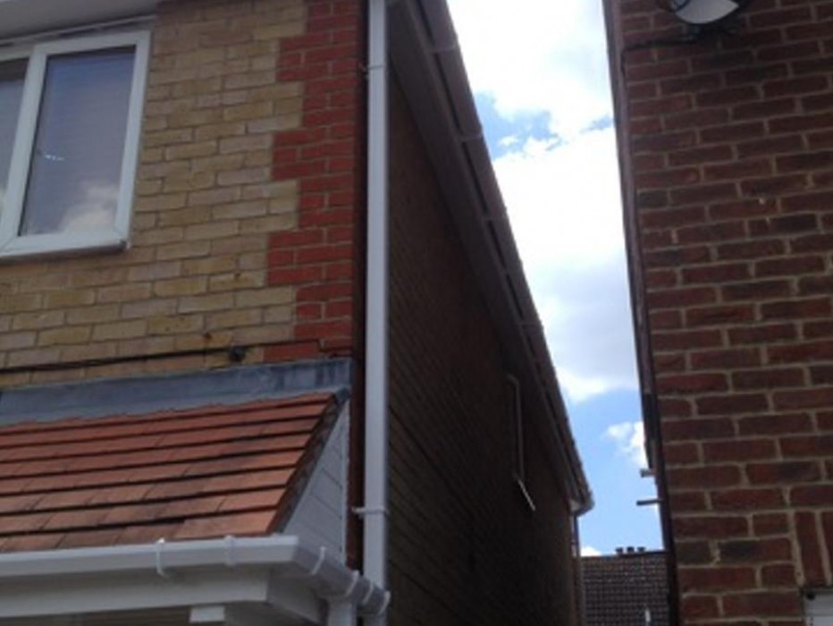 Low maintenance replacement fascia & soffit boards plus rainwater goods in white.