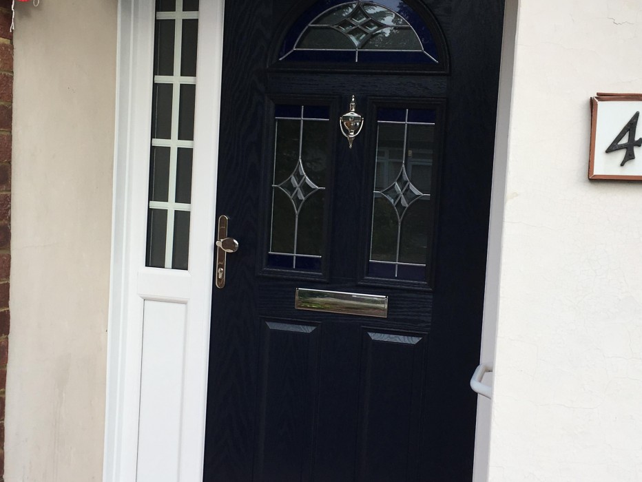 Installed in Sidcup, Magnum 8 Blue Composite door with side panel. Blue leaded feature Artwork.