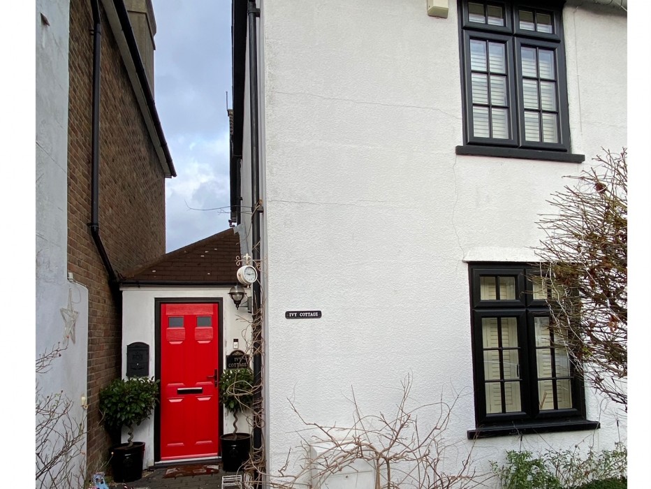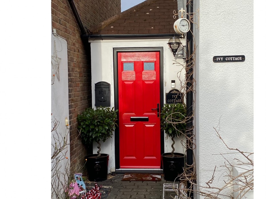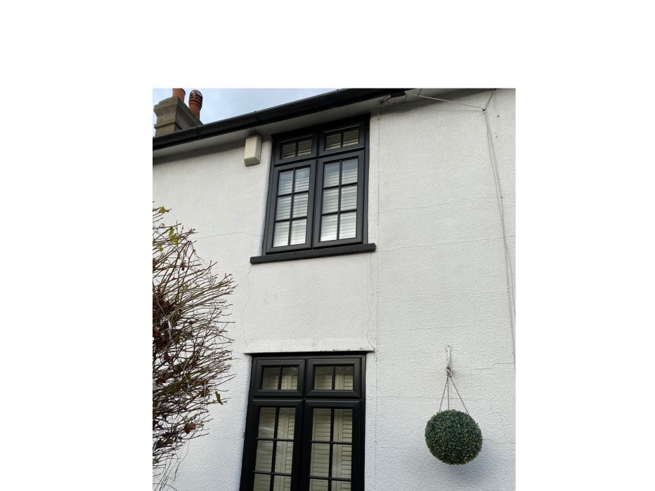 Black UPVC Casement Windows with Astegral feature bars to glass. Plus a Red Magnum 2 Composite Front Door with Black Outer Frame & Black Furniture.