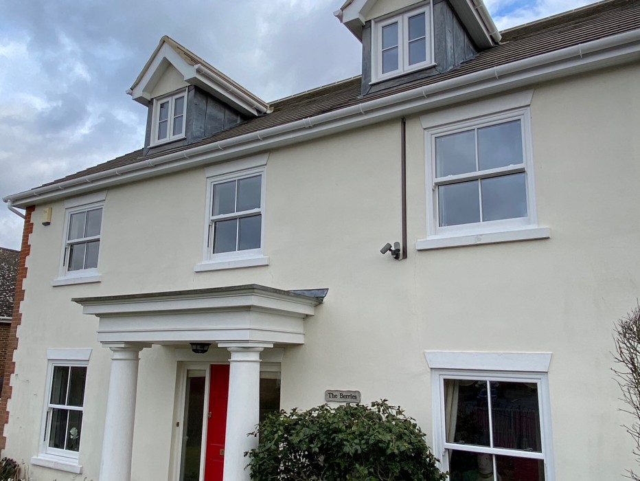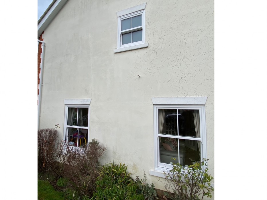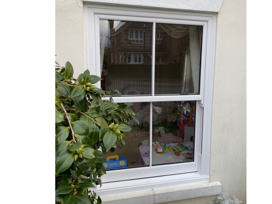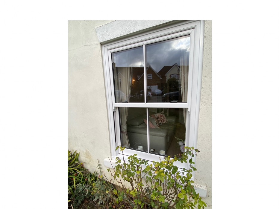White Vertical Sliders with an Astegral Bar running Vertically through the middle of the windows. Two White Casement Windows at the top conversion of the property with an Astegral Bar running horizontally through the middle.
