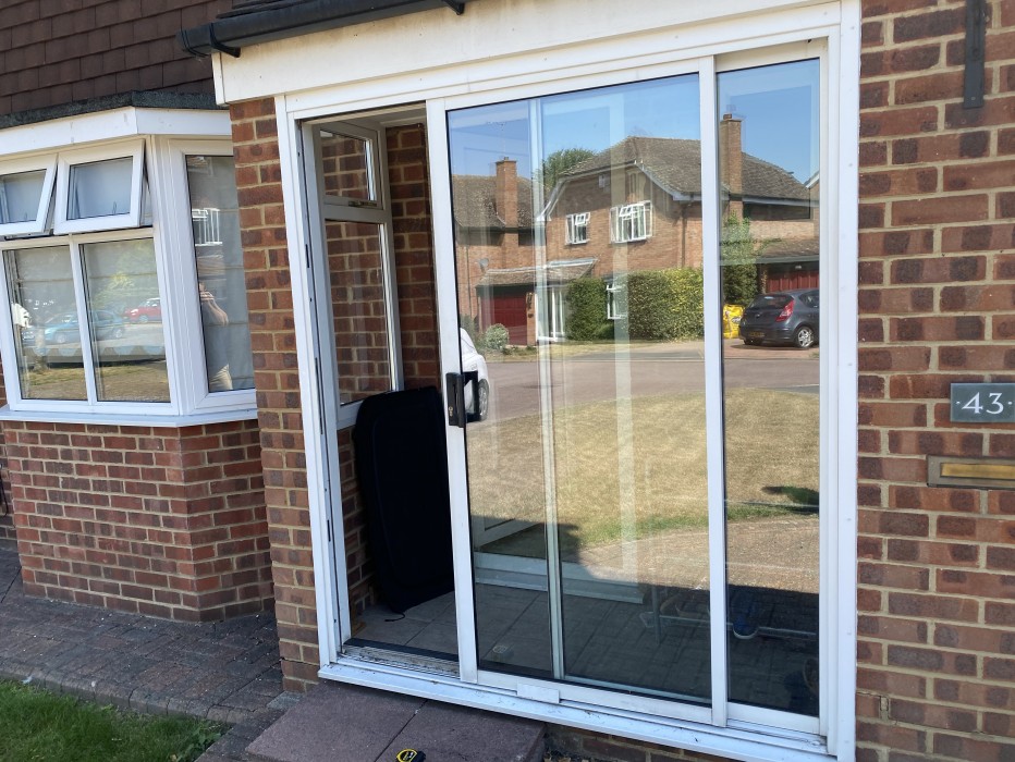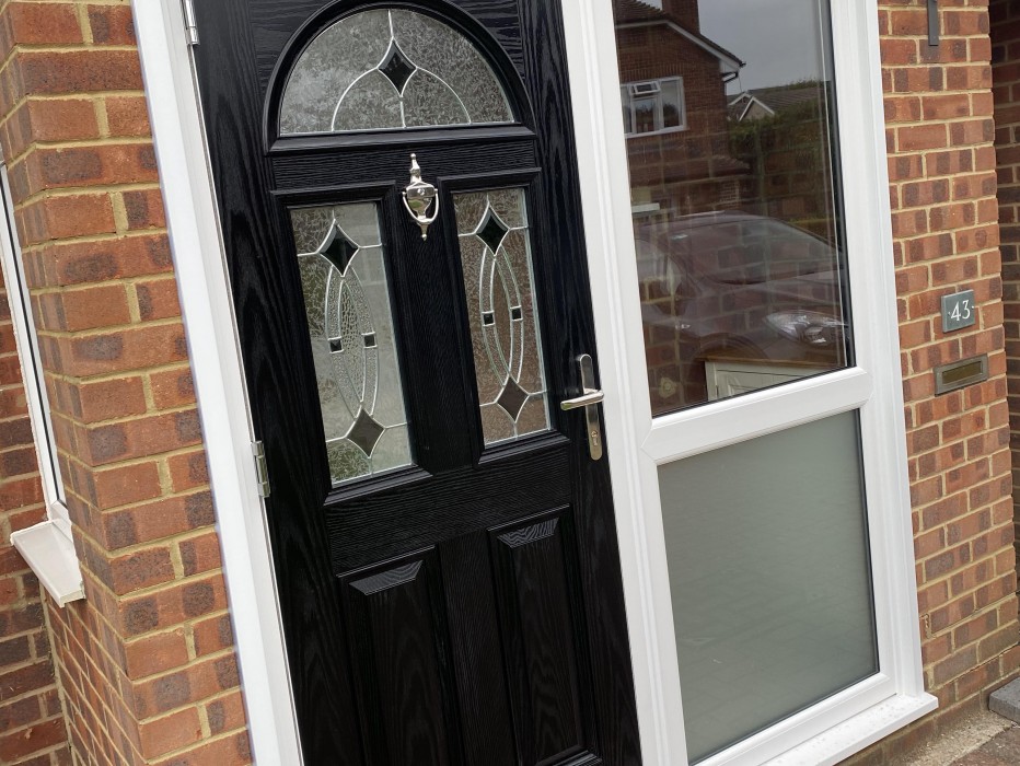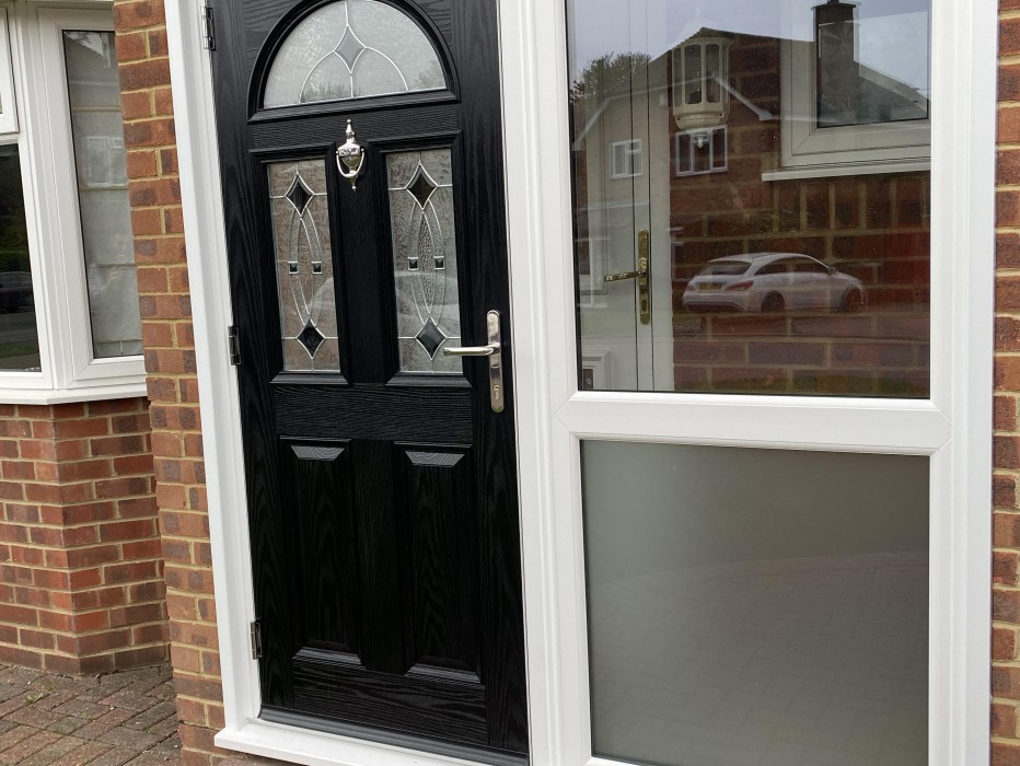 Magnum 8 Black Composite door with Luna glass. The Side Panel with clear glass to top and Satin glass to the bottom. Replacing old sliding patio doors.