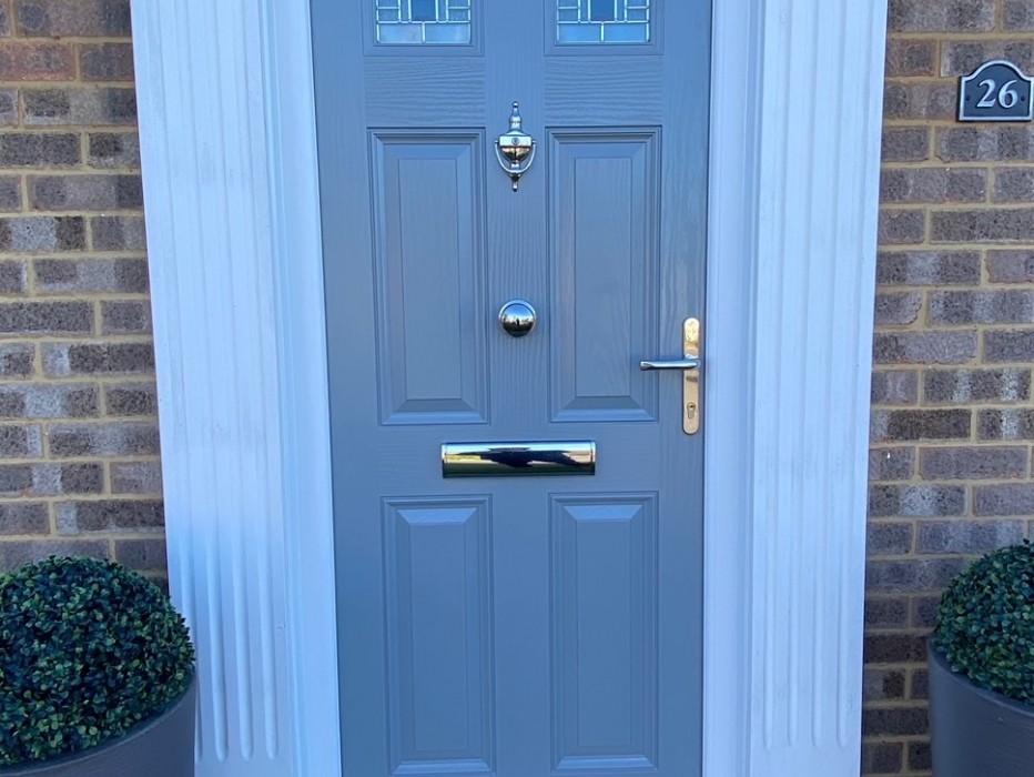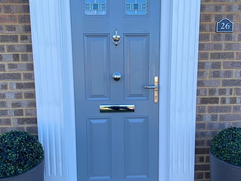 Traffic Grey Magnum 2 Composite Front Door with Aspen Decorative glass. and chrome furniture recently installed in Hextable, Kent.
