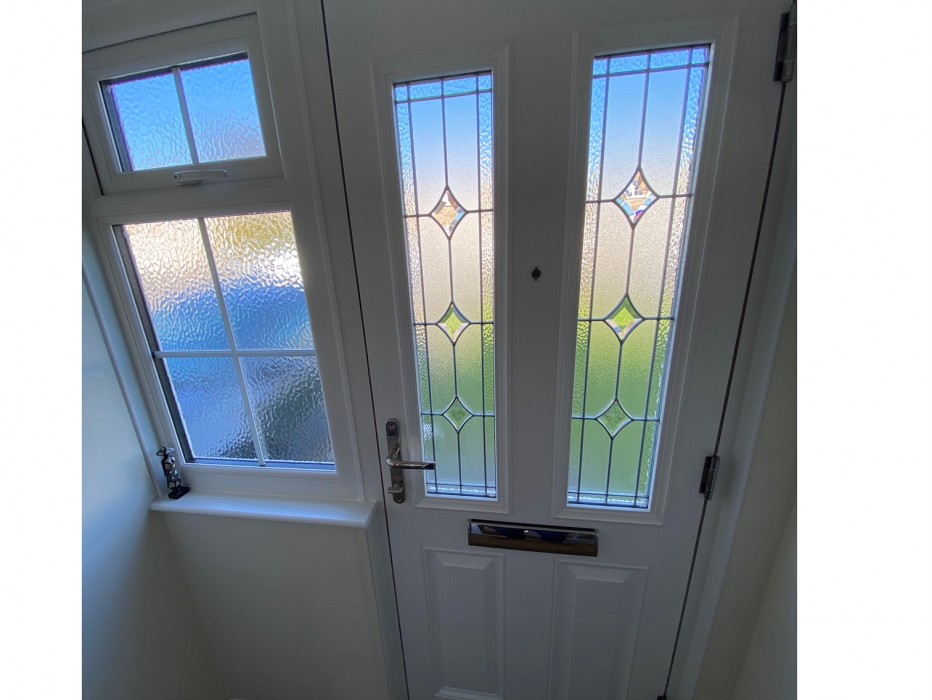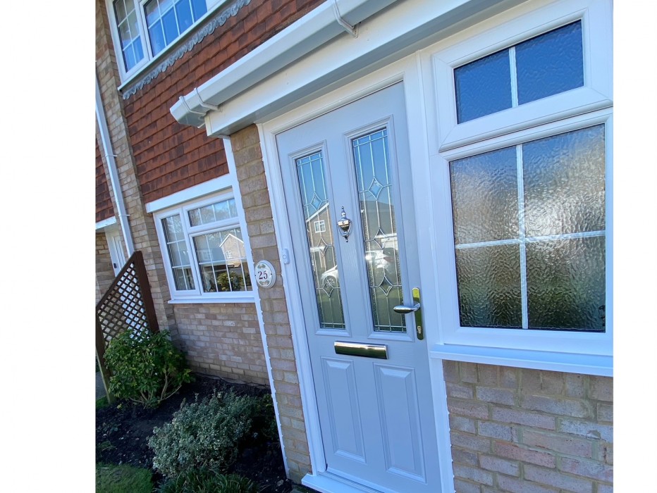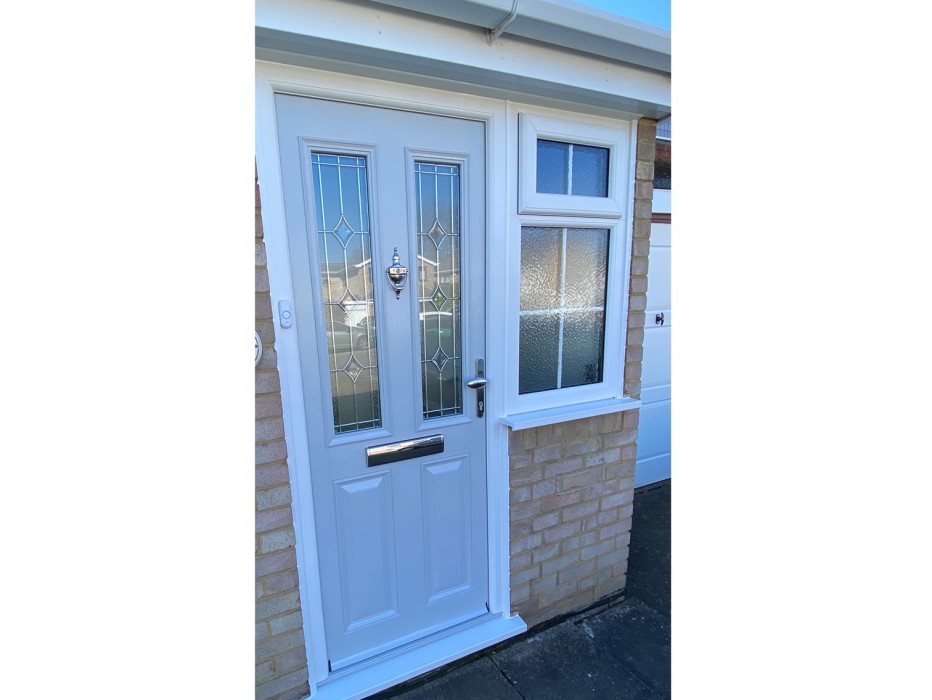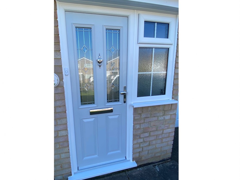 Light Grey Magnum3 Composite Front Door with Palma Glass. Side window with Minster obscure glass and White Georgian Bar.